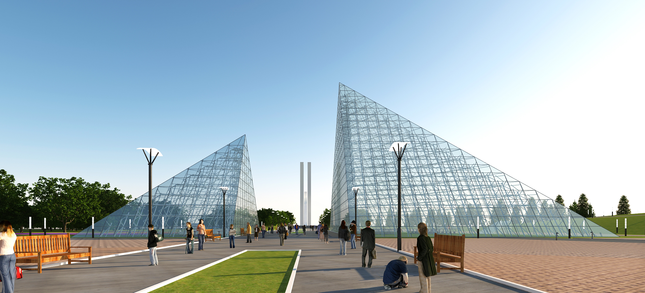Public Park (Park 1). An open space expressing urban identity, blending modern design with natural hills symbolizing Kazakhstan’s steppe and yurt-shaped pergolas. The glass pavilion area includes a large festival lawn, pergolas with traditional wool motifs, solar panels, and LED lighting. A climate-adapted Japanese garden features apple, pine, and maple trees with natural stones and gravel. Flower and BBQ gardens add early greenery with perennials, shrubs, and mature elm trees, offering family picnic amenities.